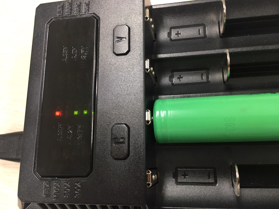 본체에 C와 V 버튼이 있으며 C버튼을 눌러서 배터리 선택. (두번째 LED 점등을 통해 확인 가능하며 왼쪽에서 오른쪽 방향으로 선택됨)